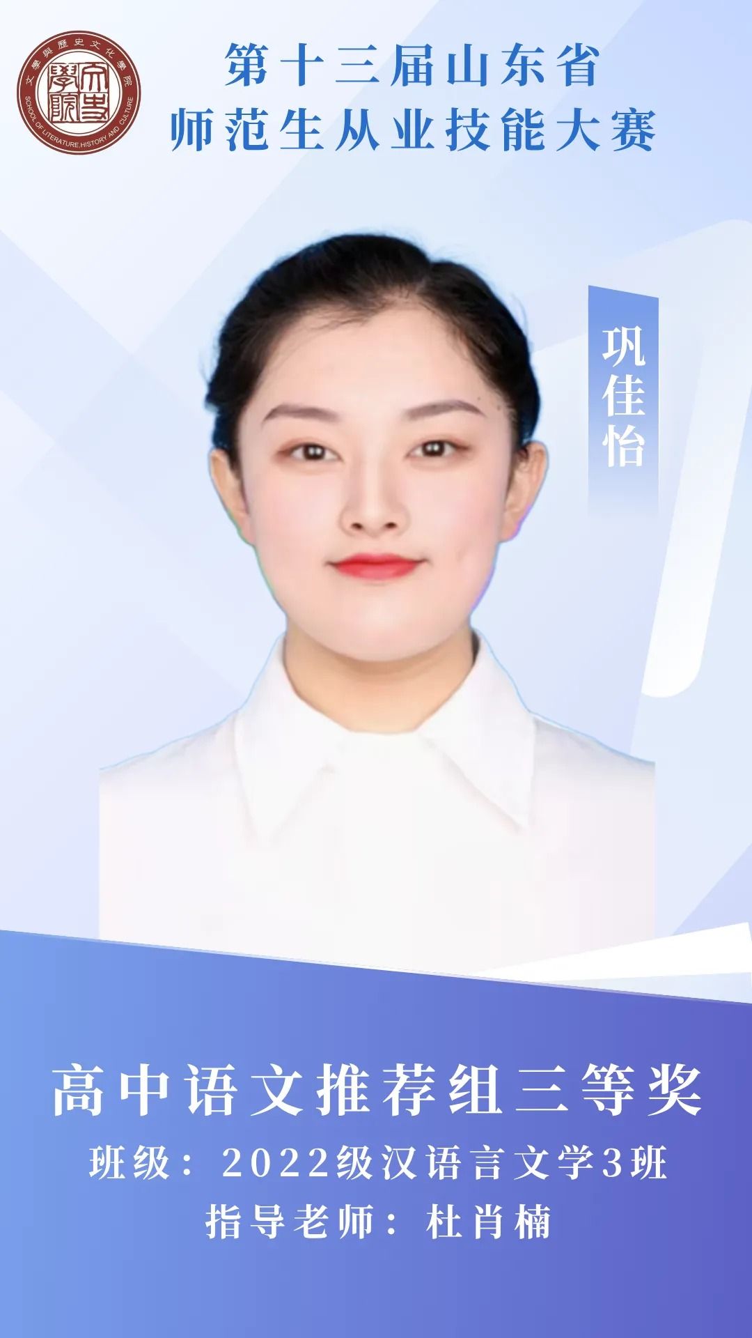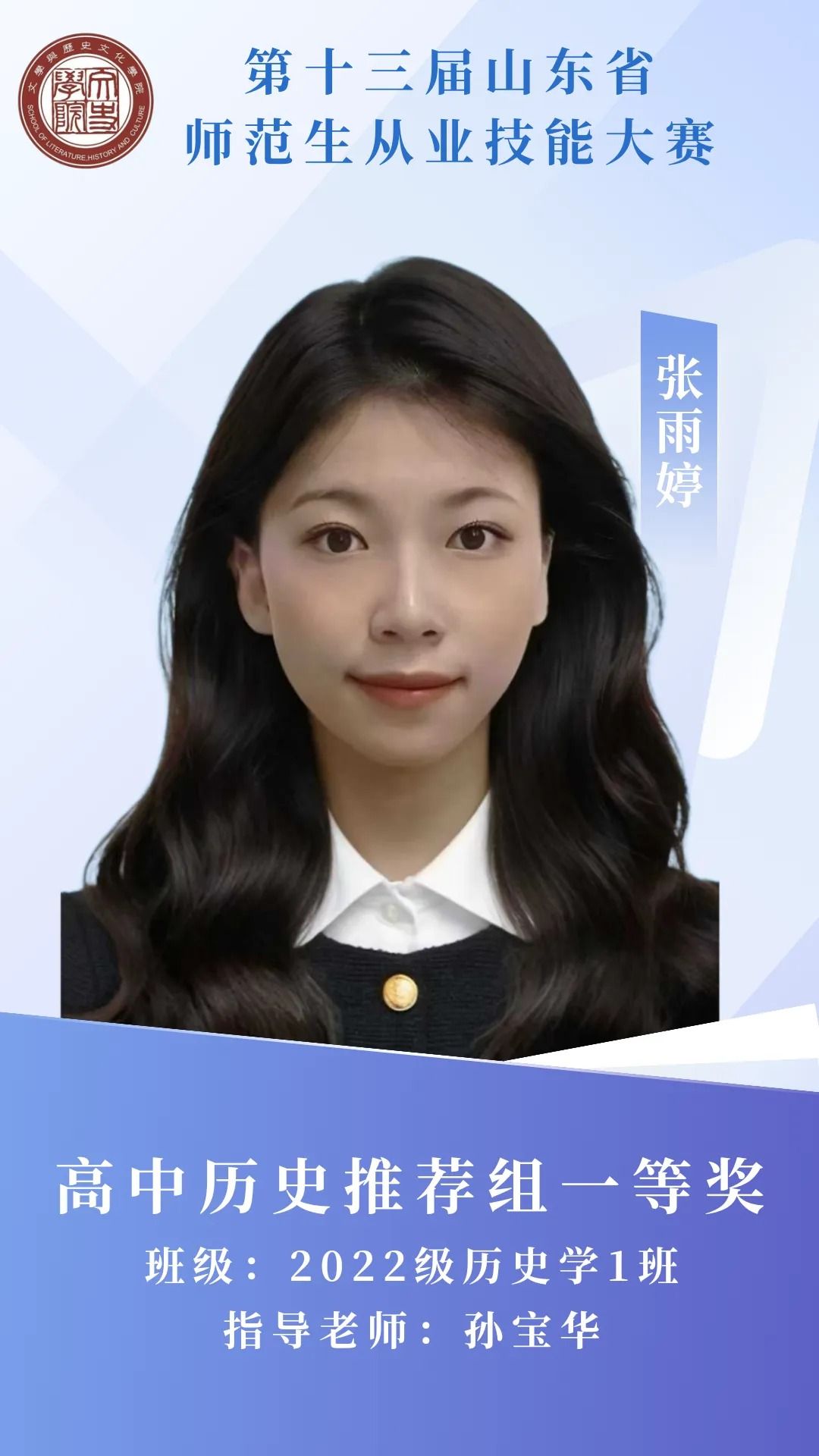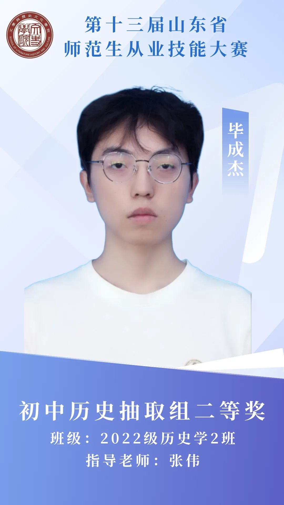 赛场砺剑,杏坛筑光;笔耕不辍,终绽芳华。那些反复打磨教案的日夜,那些模拟授课时的专注投入,都成为成长路上的注脚。热烈祝贺我院11名学子在第十三届山东省师范生从业技能大赛中突围而出,用实力捧回荣誉!今天,就让我们共同见证他们的闪耀时刻 。