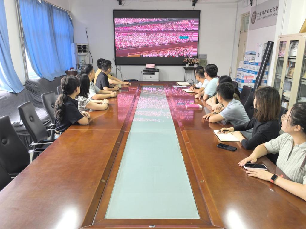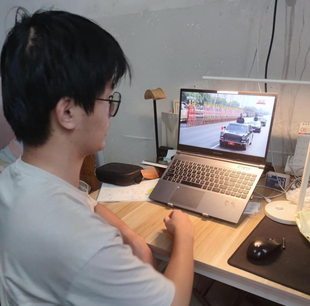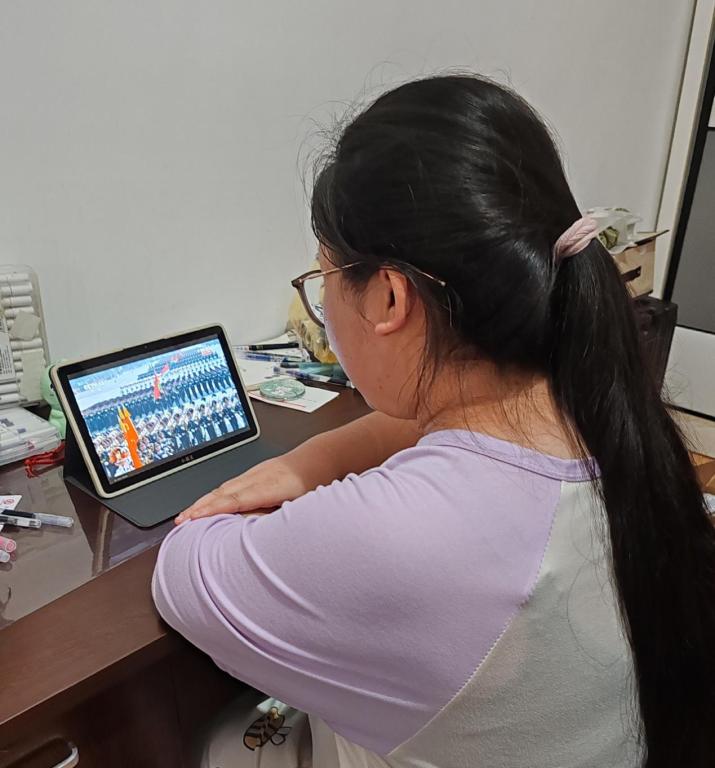 观看现场师生目光紧锁屏幕,全程专注。徒步方队迈着铿锵步伐走过时,大家屏息凝视,生怕错过整齐的行进瞬间;战旗方队亮相,屏幕上每一面印着历史印记的战旗,都让师生们不自觉俯身凑近,偶有轻声赞叹也转瞬归于沉静,全然沉浸在历史厚重与国家荣耀之中。观看结束后,师生们围绕阅兵仪式展开热烈讨论,纷纷分享感悟。