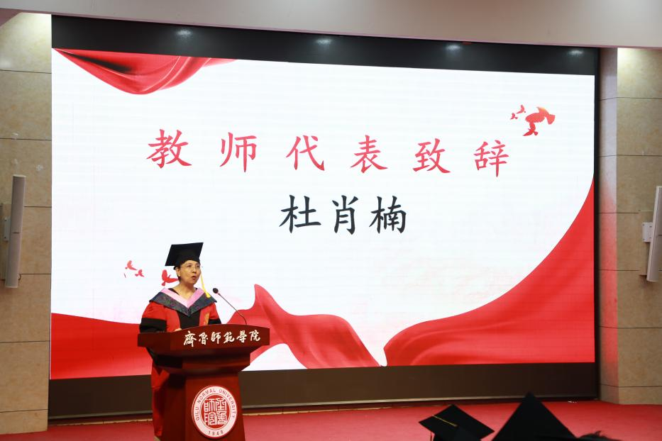 教师代表杜肖楠教授饱含深情叮嘱毕业生,希望同学们善待自己、珍惜时间,在未来生活中,刻苦学习、努力工作。步入新环境后,善待他人、尊重前辈。她代表老师们祝福全体毕业生前程似锦同筑梦,万马奔腾勇向前。