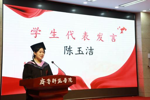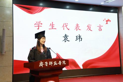 2021级学生袁玮、陈玉洁作为毕业生代表发言。她们回顾了在学院的难忘生活,感谢学院在她们人生成长的重要阶段给予的悉心教导,并表示,未来无论走到哪里,都会铭记母校的教诲,永葆初心,奋勇前行。