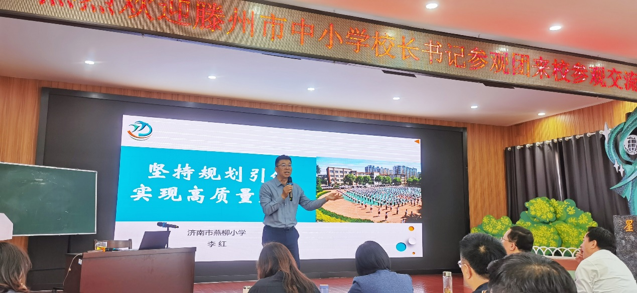 在济南市燕柳小学,党支部书记、校长李红带领研修班参观了校园文化建设,并作了题为《坚持规划引领,实现高质量发展》的精彩报告。李红校长向研修班介绍了学校“阳光教育成就多彩人生”的办学理念,详细展示了“阳光·小主人”课程体系的架构、项目化学习平台的构建。让研修成员感受到了一位有思想、有境界、有情怀的教育家型校长的魅力。